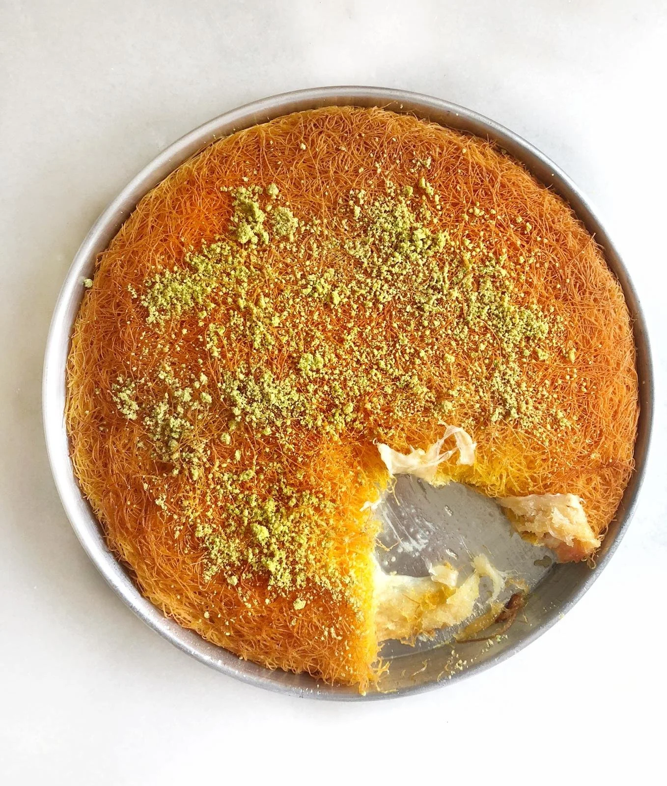 Sweet knafeh served piping hot, drizzled with syrup & pistachios